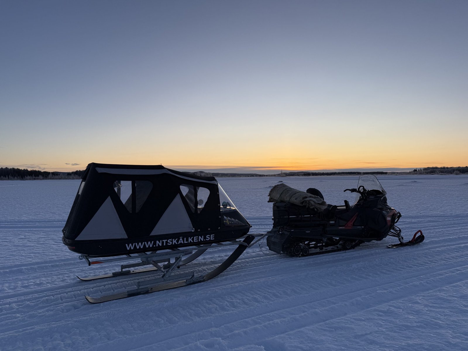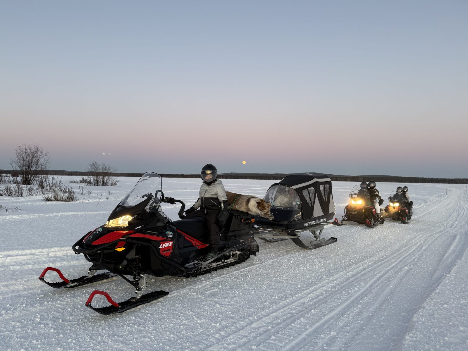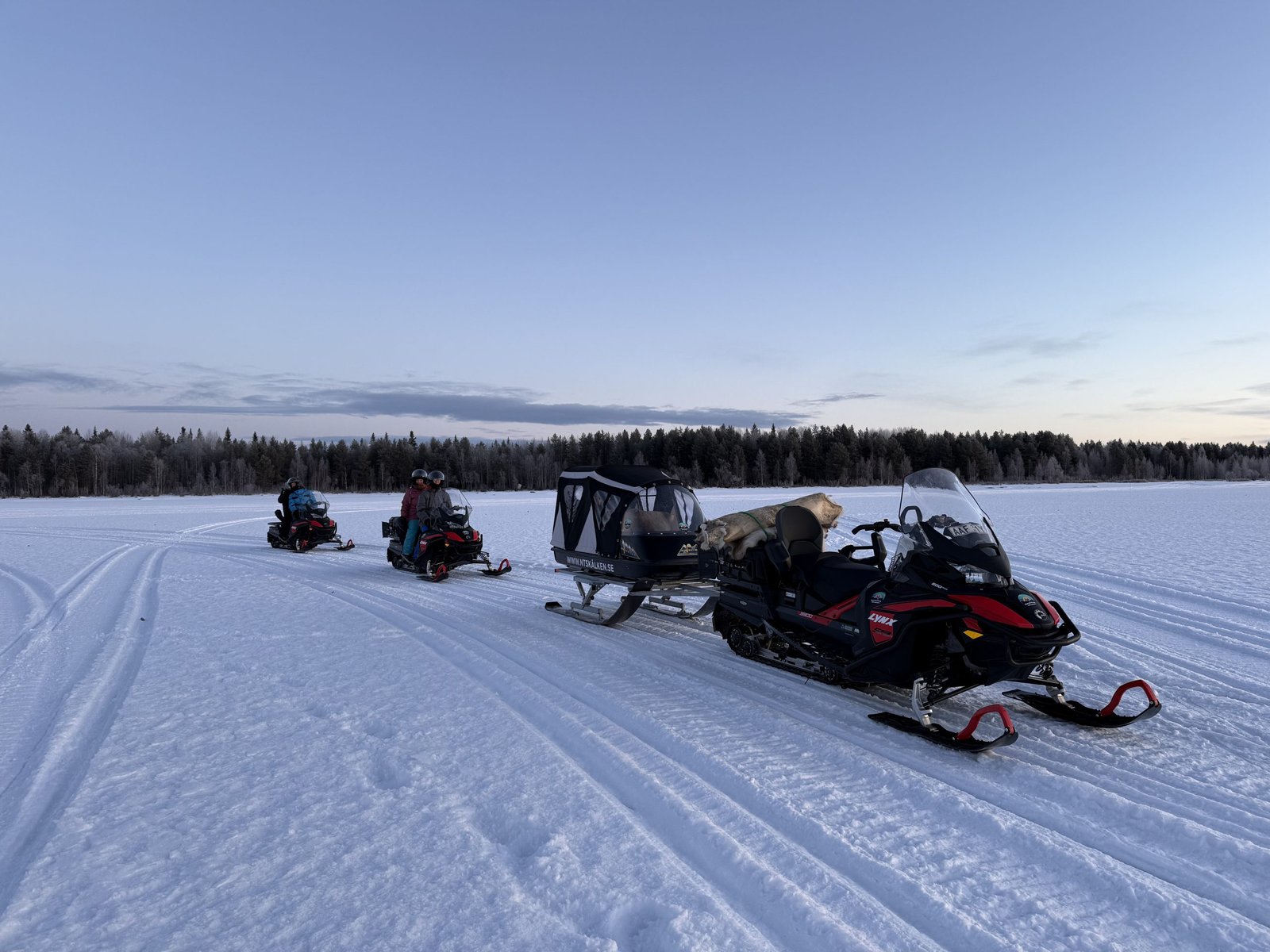Children are welcome to join the adventure with us in a comfortable, covered sleigh. For safety reasons, they must ride in the sleigh if they cannot reach both the foot platform and the handles on the snowmobile.