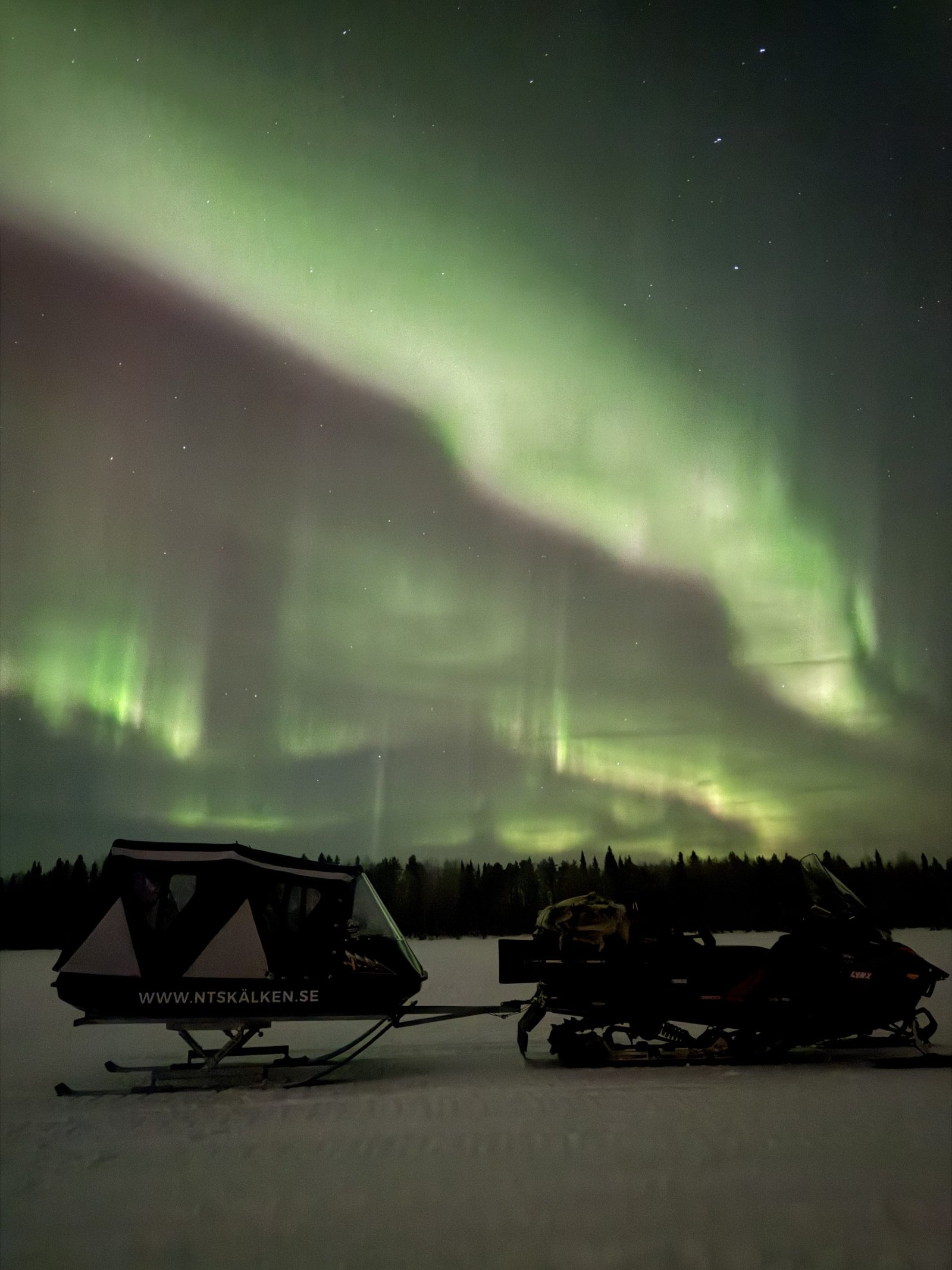 Let yourself be carried deep into the Arctic night on a peaceful ride through snow-covered landscapes. Seated comfortably in a cozy sled pulled behind your guide’s snowmobile, you’ll glide under the stars in search of the northern lights.